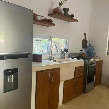 La cocina completa está equipada con nevera y un horno.